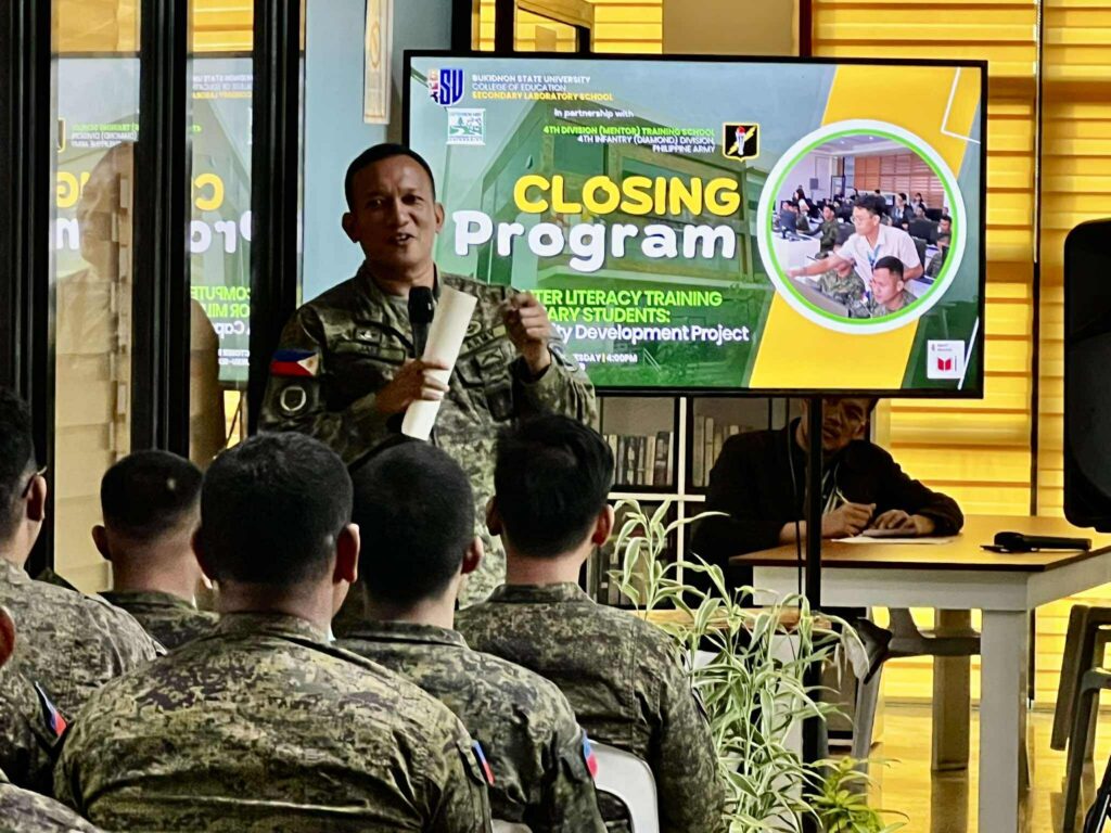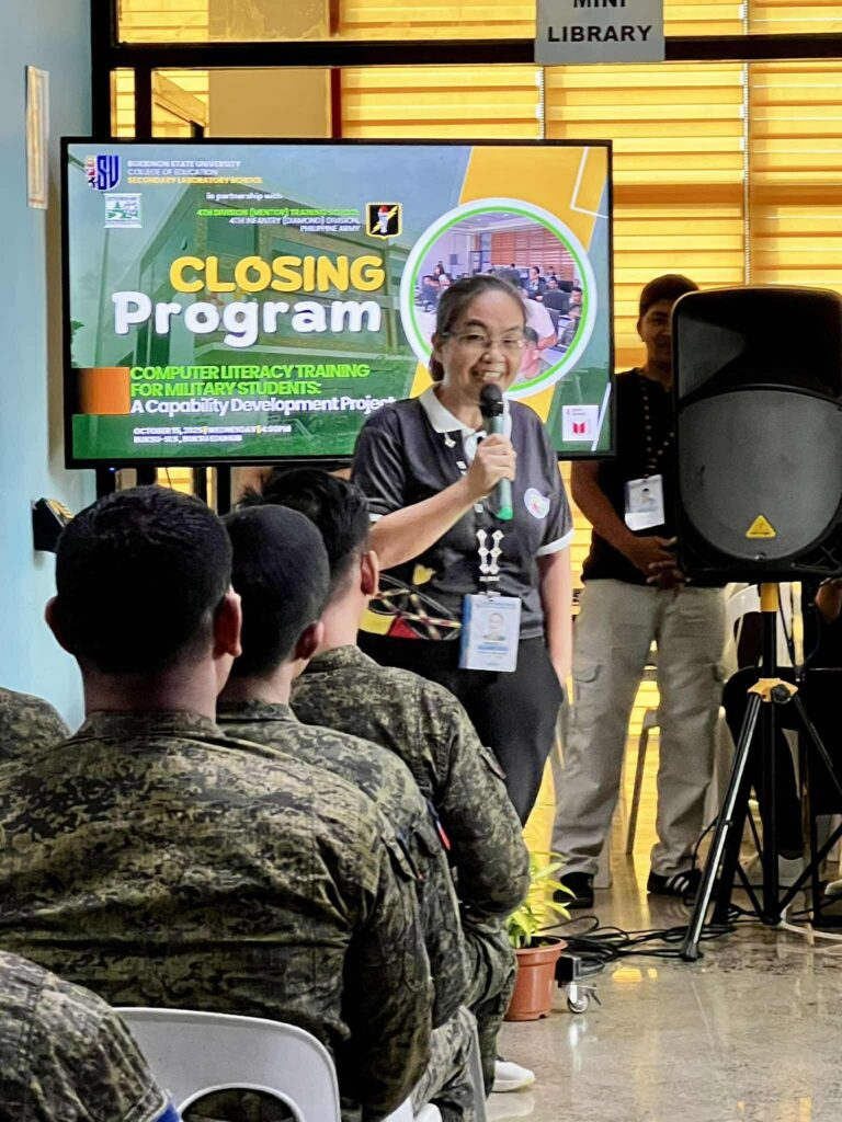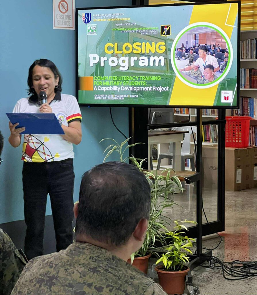 The Phase 5 implementation of SLS’s extension project titled “Computer Literacy Training for Military Students: A Capability Development Project” wrapped up through a Closing Program at the High School Gymnasium, BukSU EduHub, Casisang, Malaybalay City, Bukidnon on October 15, 2025.