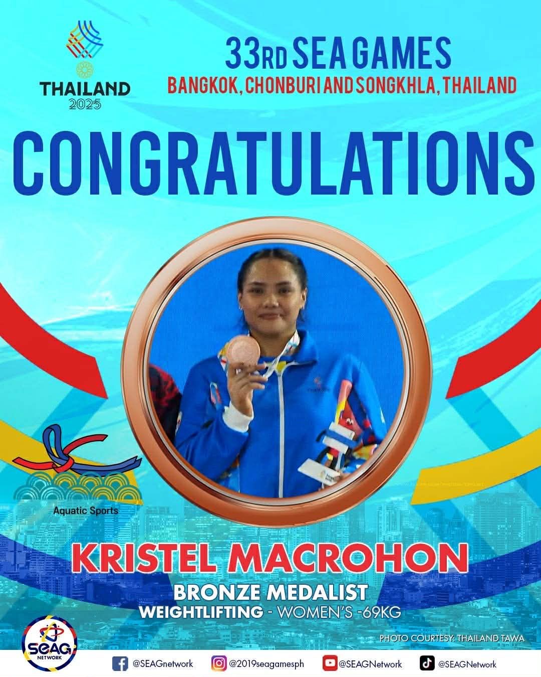 Zamboangueña Kristel Macrohon clinches a bronze medal in the Weightlifting competition for 69-kg category in the 2025 South East Asian (SEA) Games being held in Thailand crom Dec. 9 to 20, 2025.