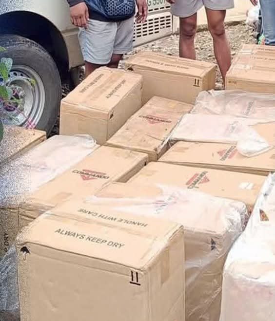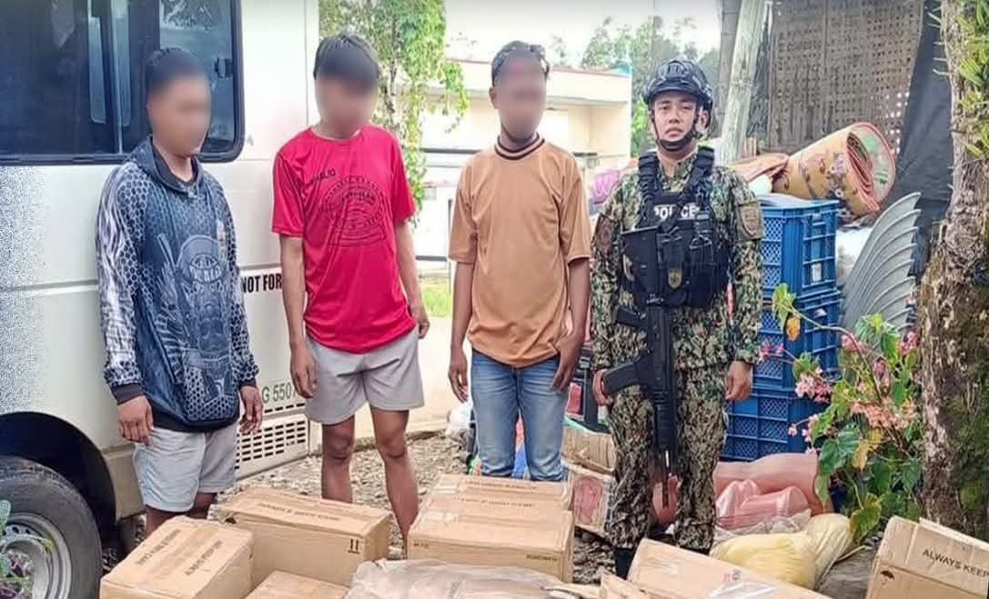 Dakpan ang duha ka lalaki ug narekober sa mga otoridad ang P1.5 milyon nga kantidad sa puslit nga yosi sa Barangay Malinao, Kalilangan, Bukidnon adtong Martes, Disyembre 23, 2025.
