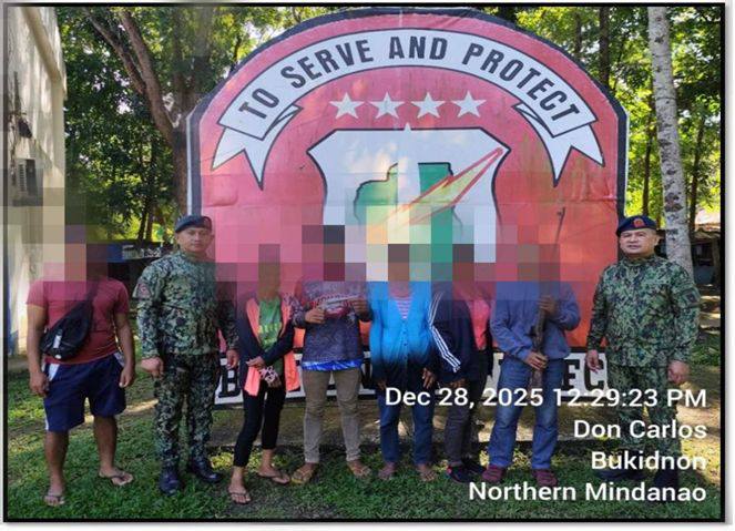 Ni-surrender ang lima ka miyembro sa Militia ng Bayan ubos sa Sub-Regional Committee (SRC) 2, North Central Mindanao Regional Committee (NCMRC) sa mga otoridad adtong Disyembre 28, 2025 takna 12:30 sa udto sa Purok Mauswagon, Barangay Pinamaloy, Don Carlos, Bukidnon.