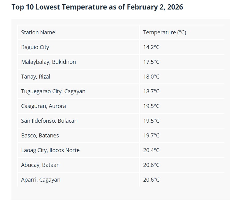 Ikaduha ang Malaybalay City nga capital sa probinsya sa Bukidnon sa pinakabugnaw nga lugar sa tibook Pilipinas tungod sa nasinati nga Amihan karung adlaw nga Lunes, Pebrero 2, 2026.