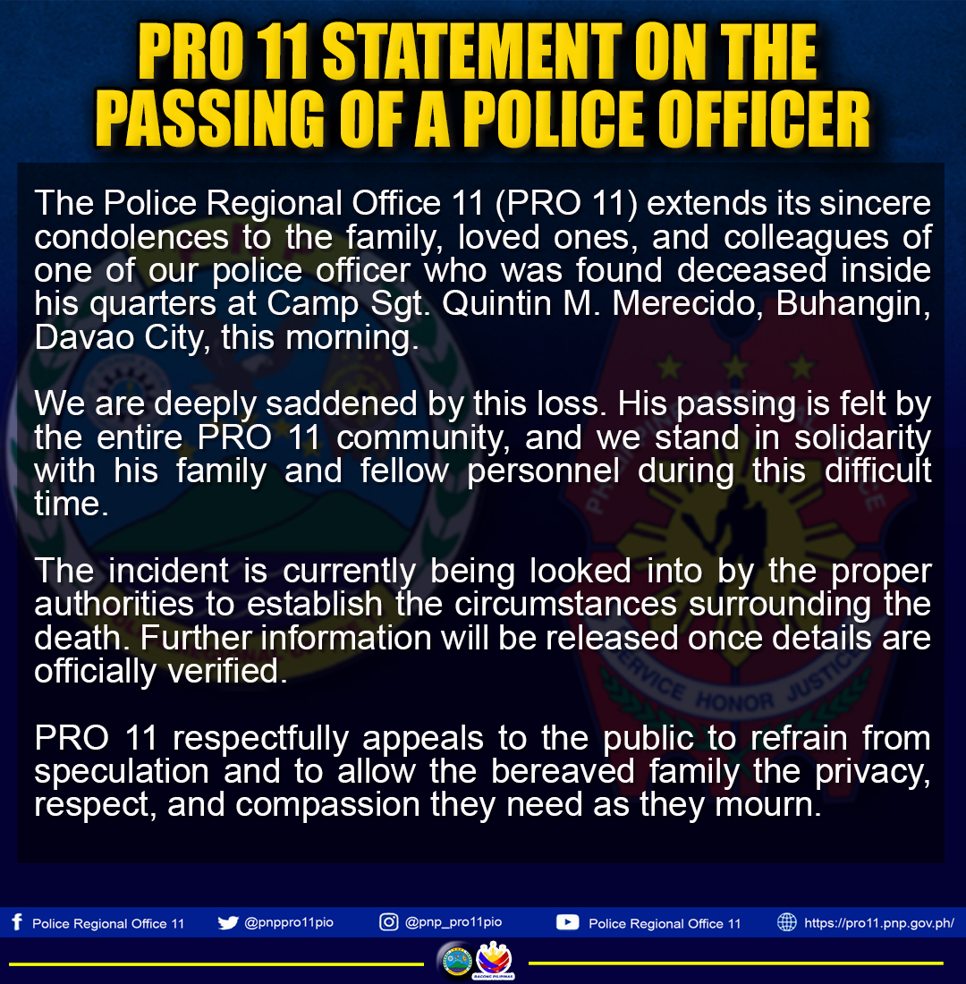 condolences to the family, loved ones, and colleagues of one of our police officer who was found deceased inside his quarters at Camp Sgt. Quintin M. Merecido, Buhangin, Davao City, this morning.