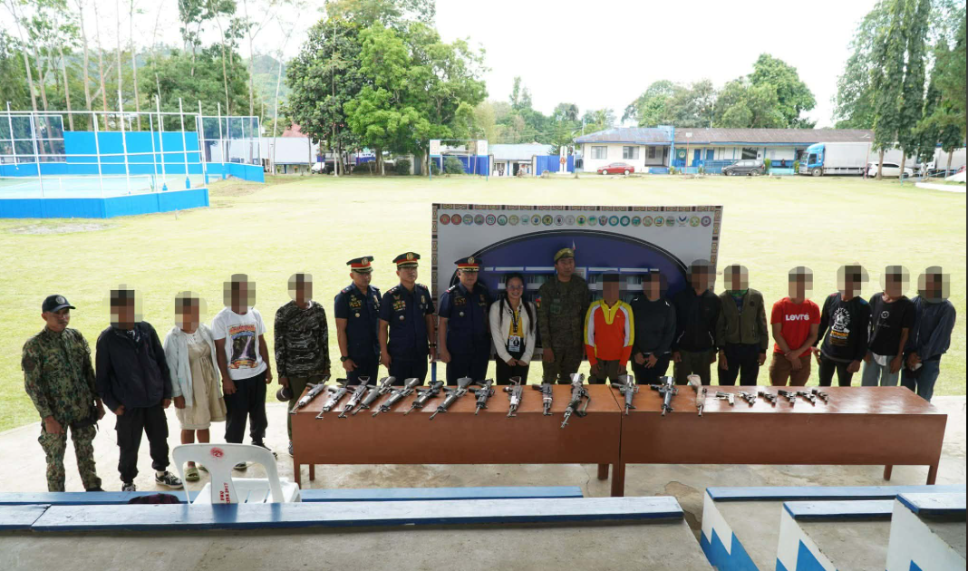 Giturn-over ang 20 ka assorted high-powered firearms gikan sa kanhi 13 ka miyembro sa New People’s Army (NPA) sa Camp Captain Ramon M Onahon, Malaybalay City, Bukidnon niadtong Pebrero 12, 2026.