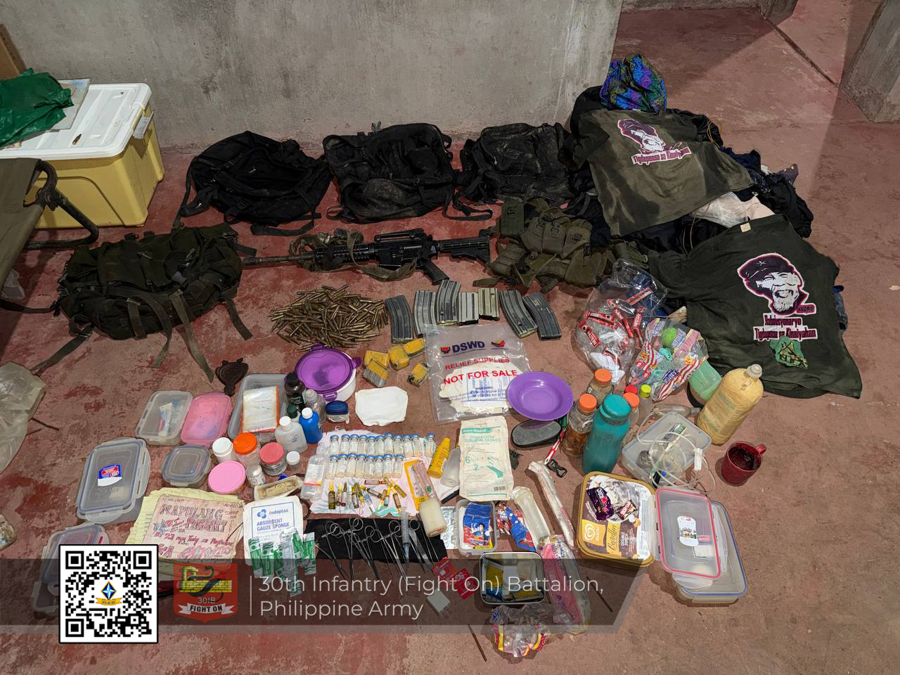 Lakip sa mga butang nga nasuta ang usa ka R4 rifle, pipila ka mga bala ug mga magasin, bandolier, mga backpack nga adunay personal nga gamit, ug mga subersibong dokumento.