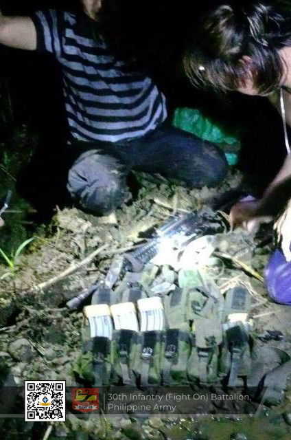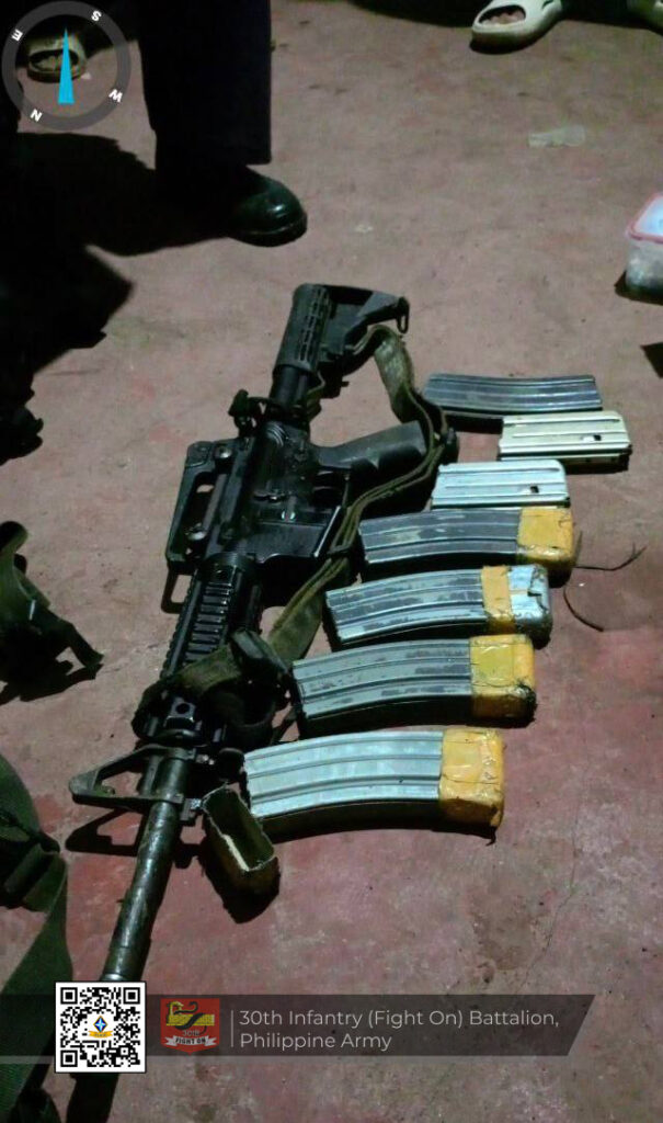Narekober ang mga armas ug war materials nga gituohang panag-iya sa miyembro sa New People’s Army (NPA) atol sa operasyon sa mga kasundaluhan sa Sitio Lago, Brgy. Carromata, San Miguel, Surigao del Sur niadtong Miyerkules, Marso 11, 2026.