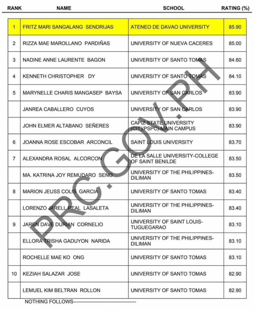 Ayon sa PRC, pinagunahan nito ang naturang eksaminasyon na may overall rating na 85.90% mula 2,924 out of 4,784 na pumasa sa buong bansa.